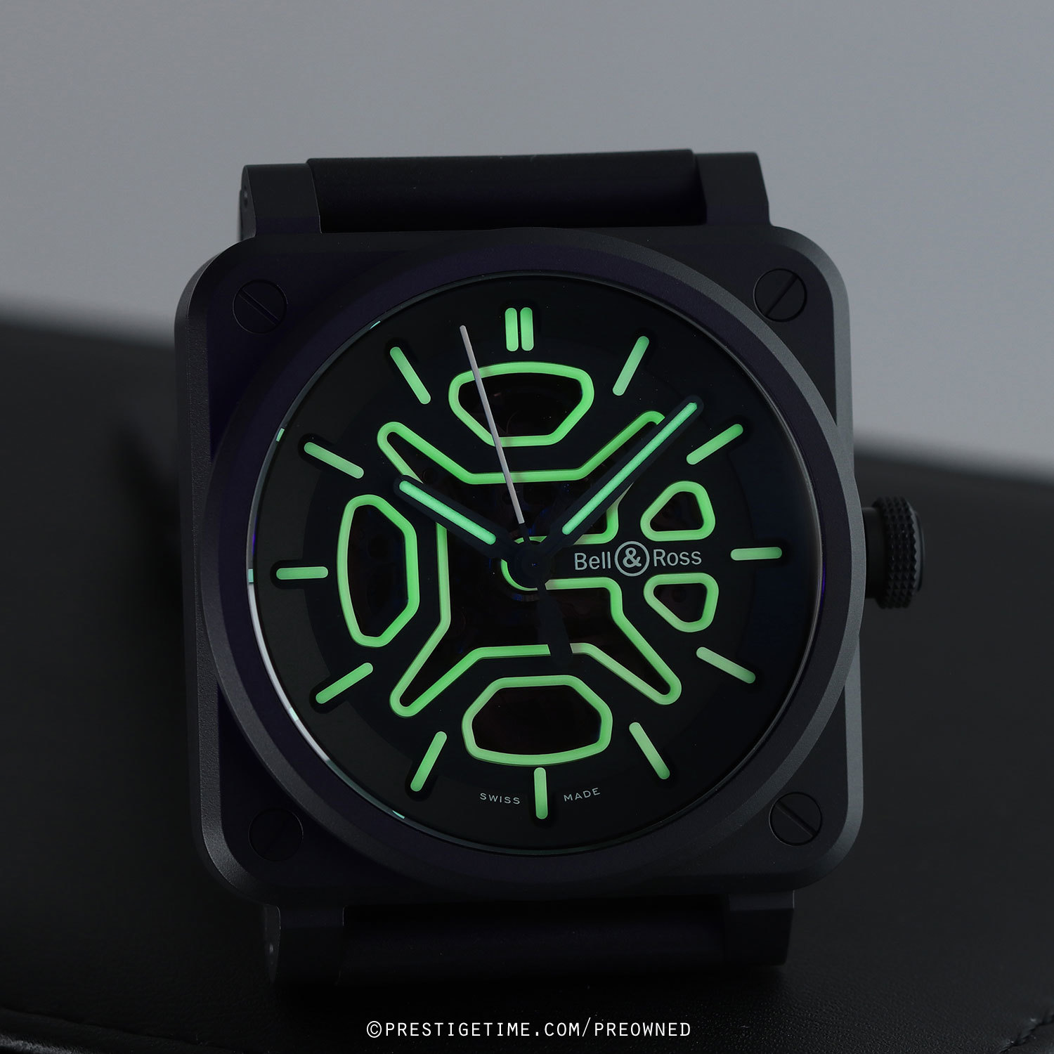 Case: Microblasted black ceramic case. Skeletonized black dial with Super-LumiNova® X1 C3 outlines tracing the cutout lines. Black hour & minute hands with luminous fill. White seconds hand. Applied black luminous hour markers.