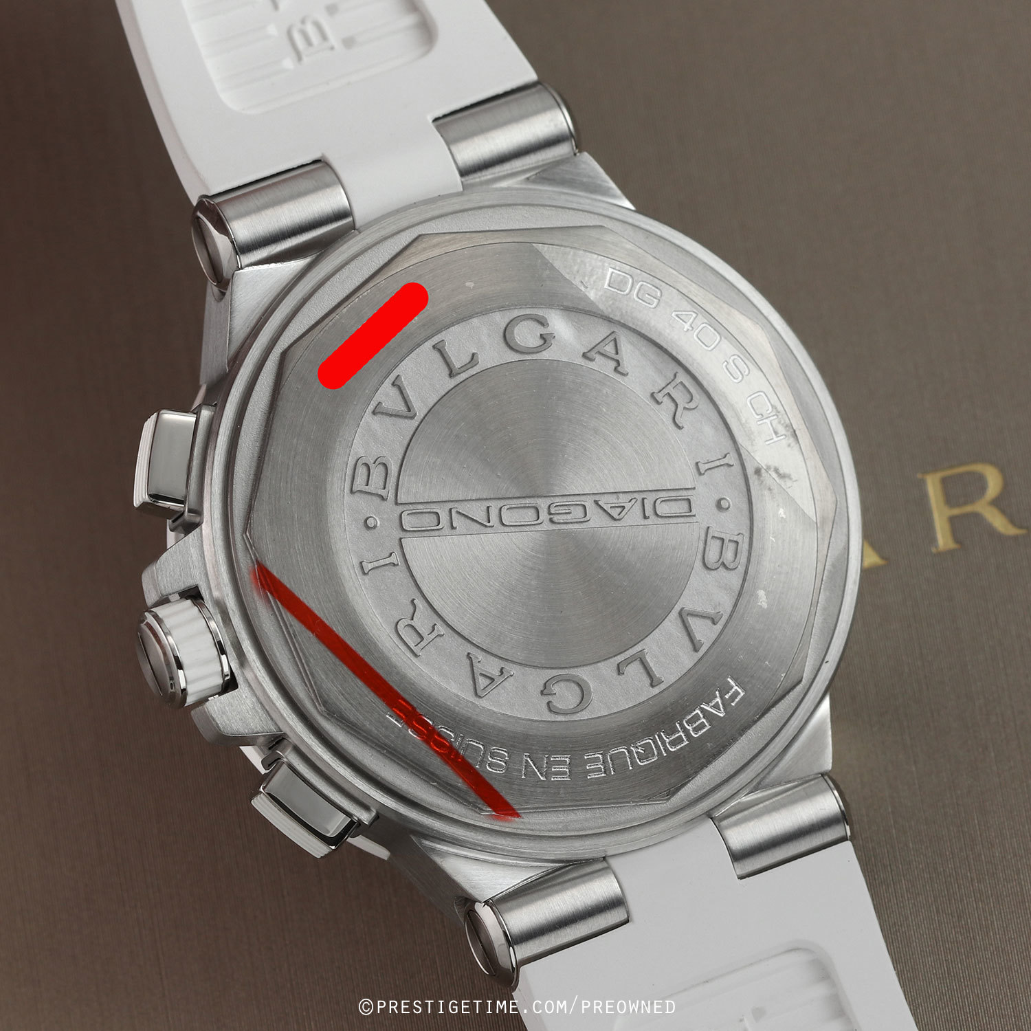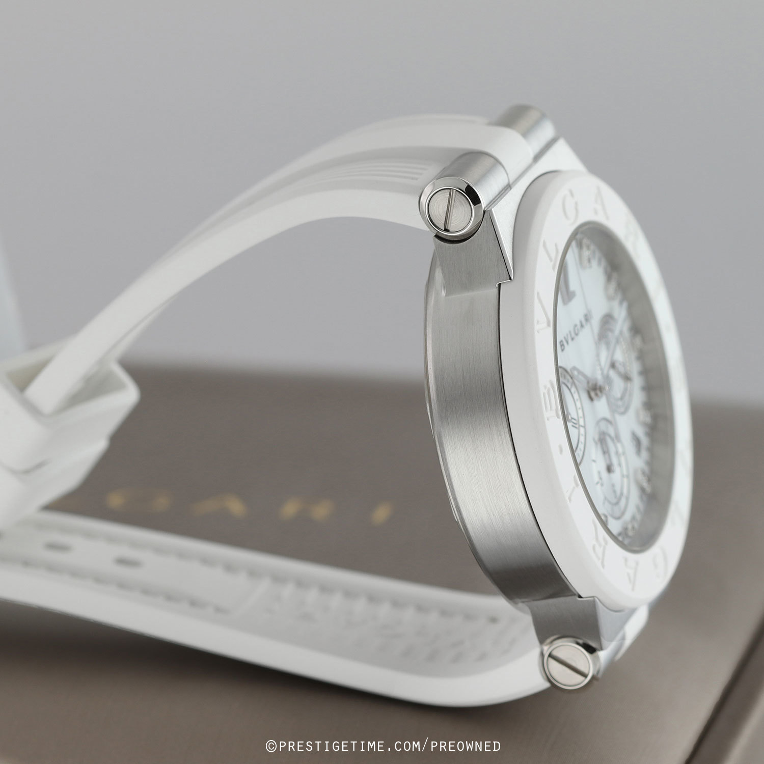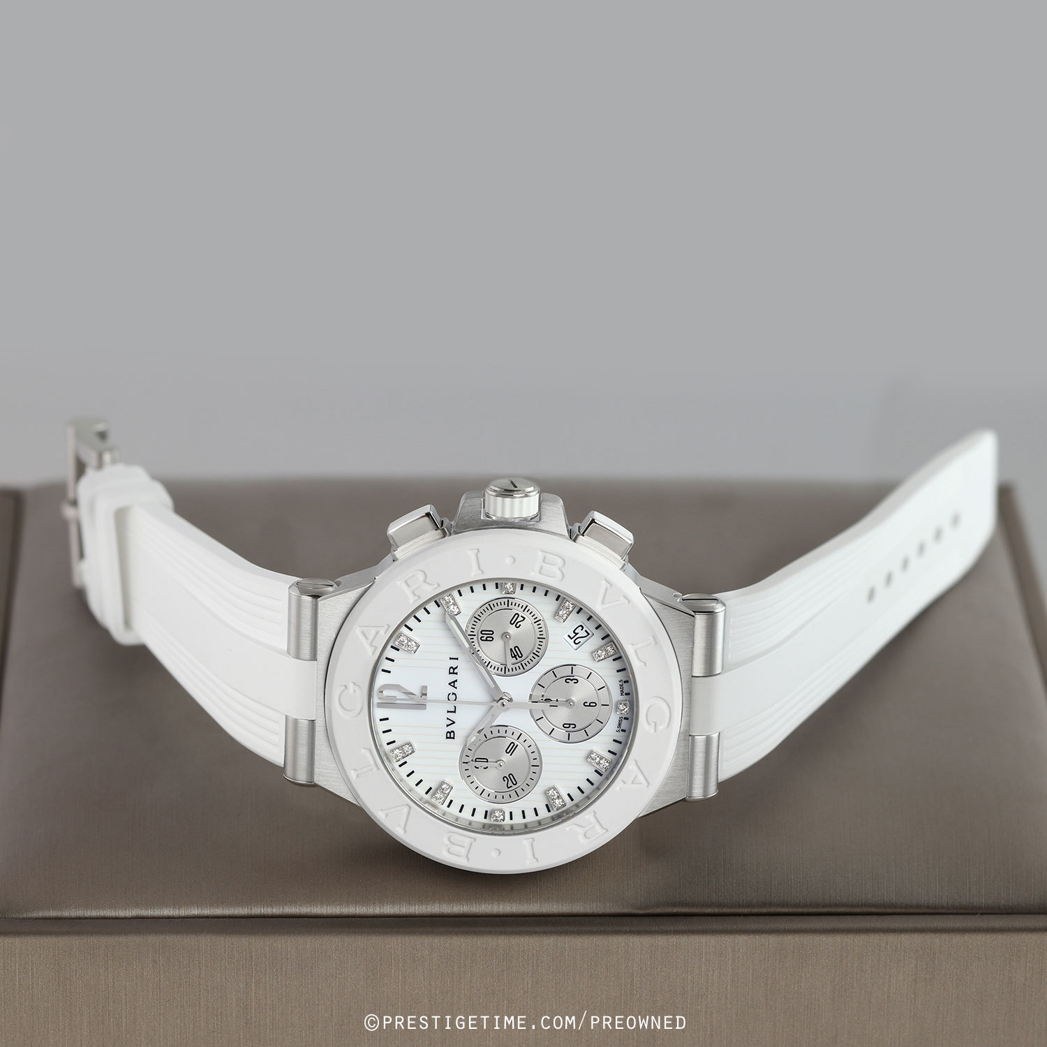 Case: Brushed stainless steel case. Polished stainless steel crown & buttons with white rubber grip & tips. White rubber coated steel bezel embossed with the iconic BVLGARI•BVLGARI logo. White mother of pearl dial with a vertical linear engraved pattern. Silver sub-dials. Applied diamond hour markers, excluding the applied polished 12 o'clock marker. Polished hands, the hour & minute hands partially skeletonized with luminous tips. Fine printed minute/seconds track on the dial perimeter. Small seconds sub-dial at 3 o'clock. Date window between 4 & 5 o'clock.