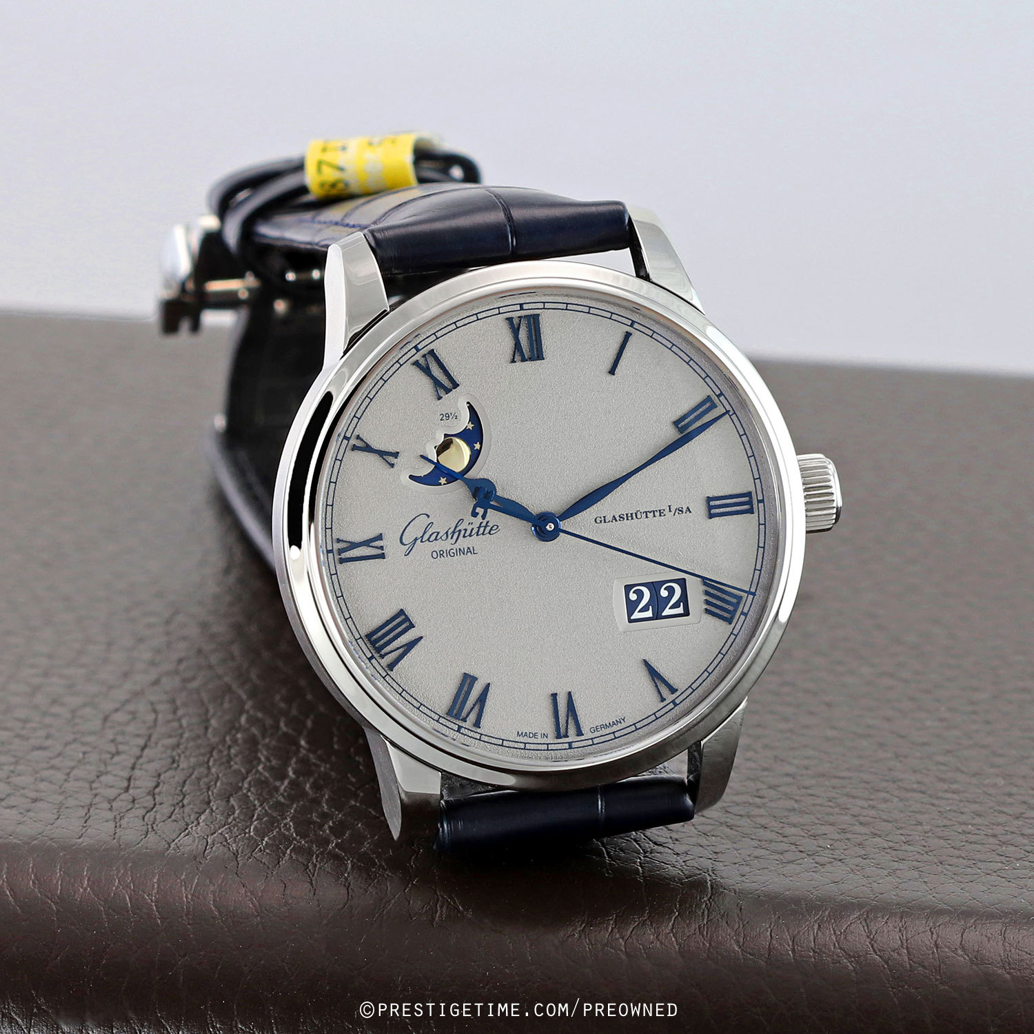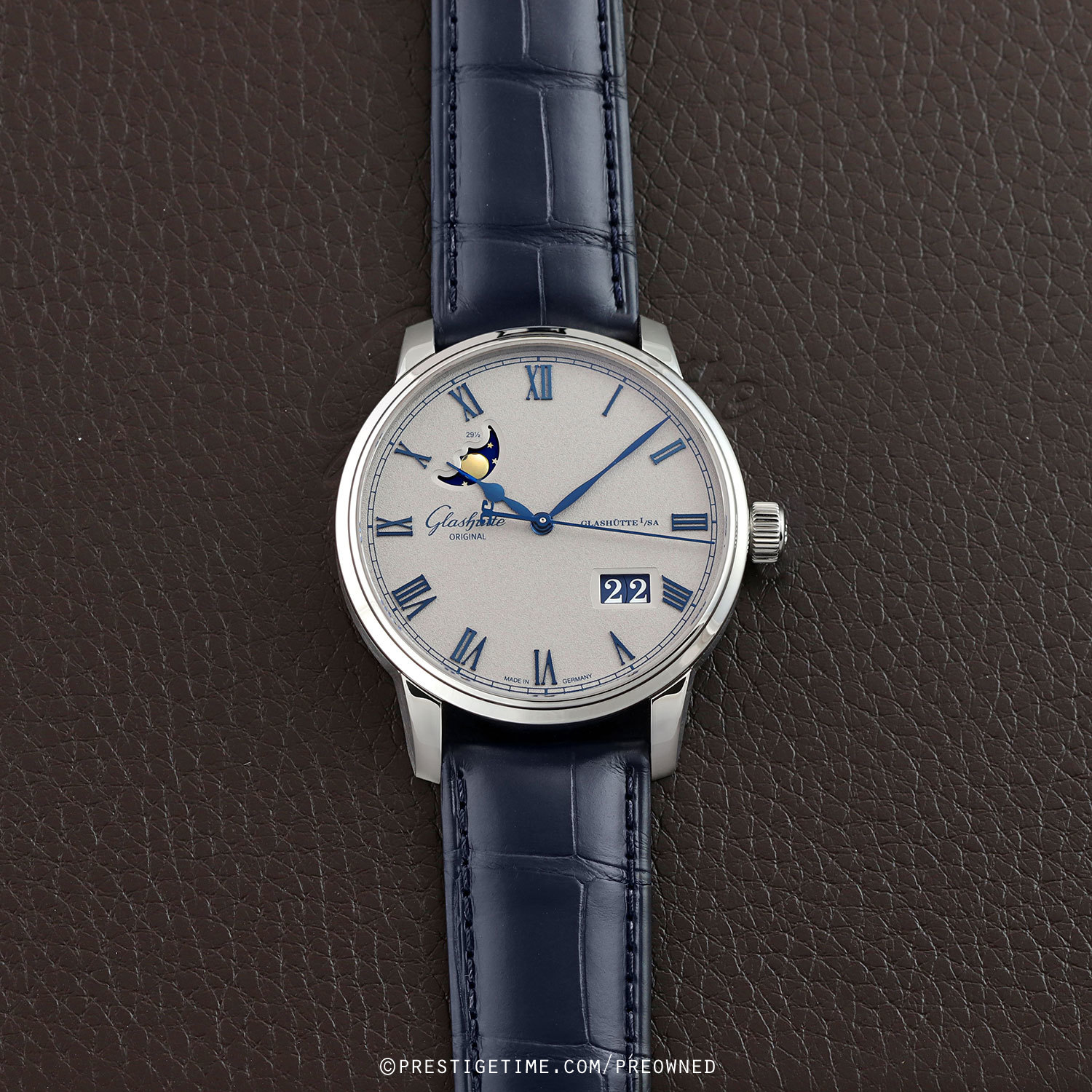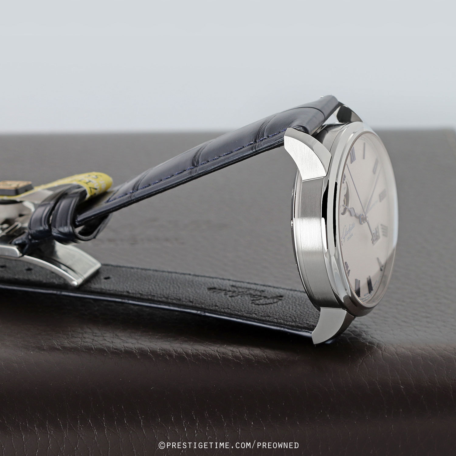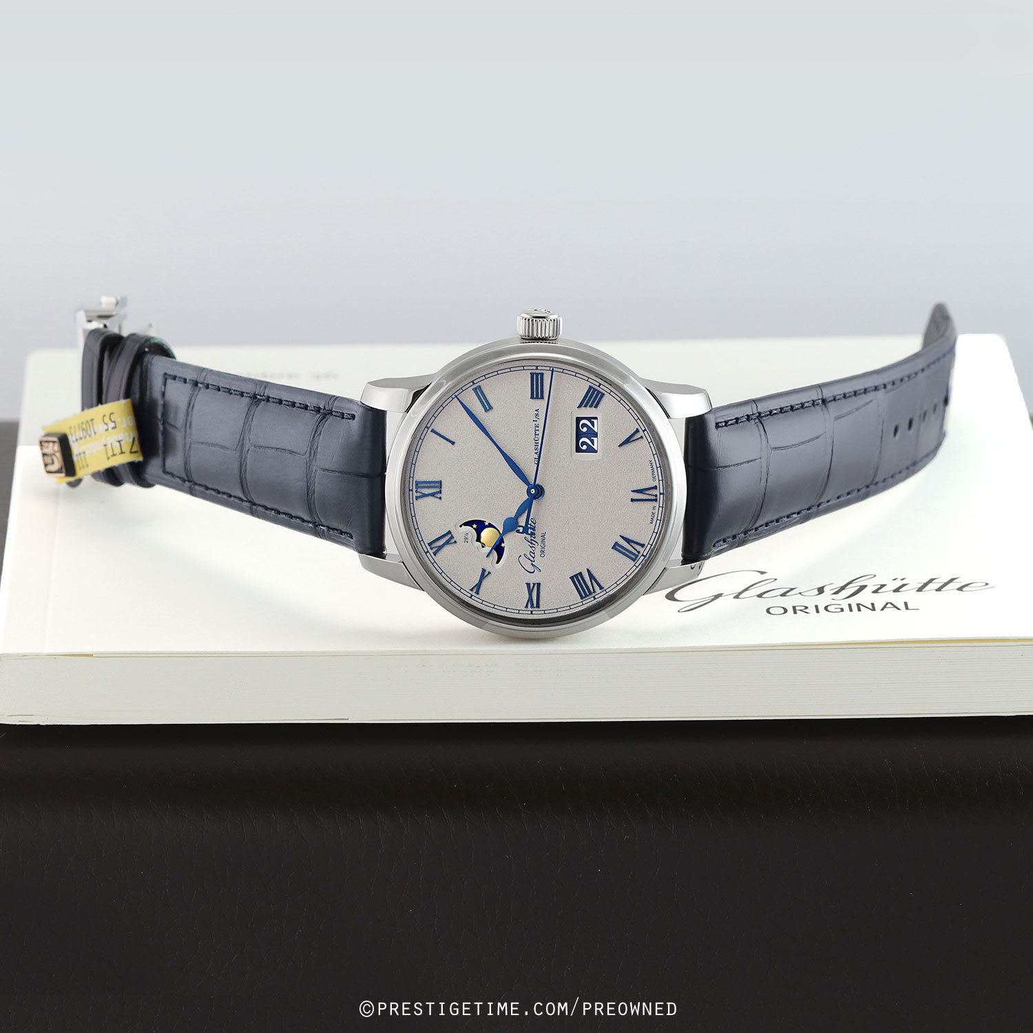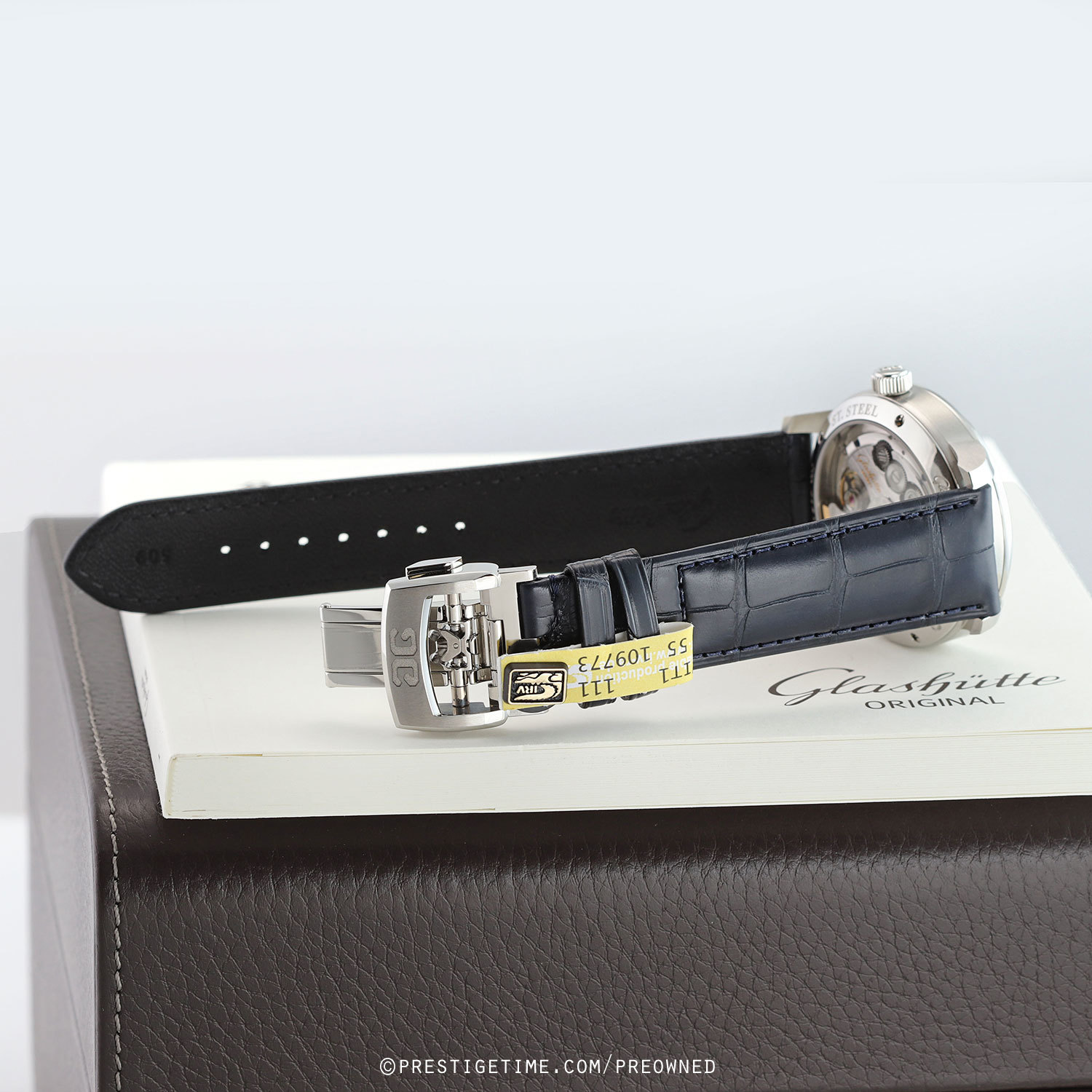 Strap: Fitted on its original Glashutte Original blue alligator leather strap with a stainless steel deployant buckle. The strap is unworn, in new condition with its full wear lifespan remaining.