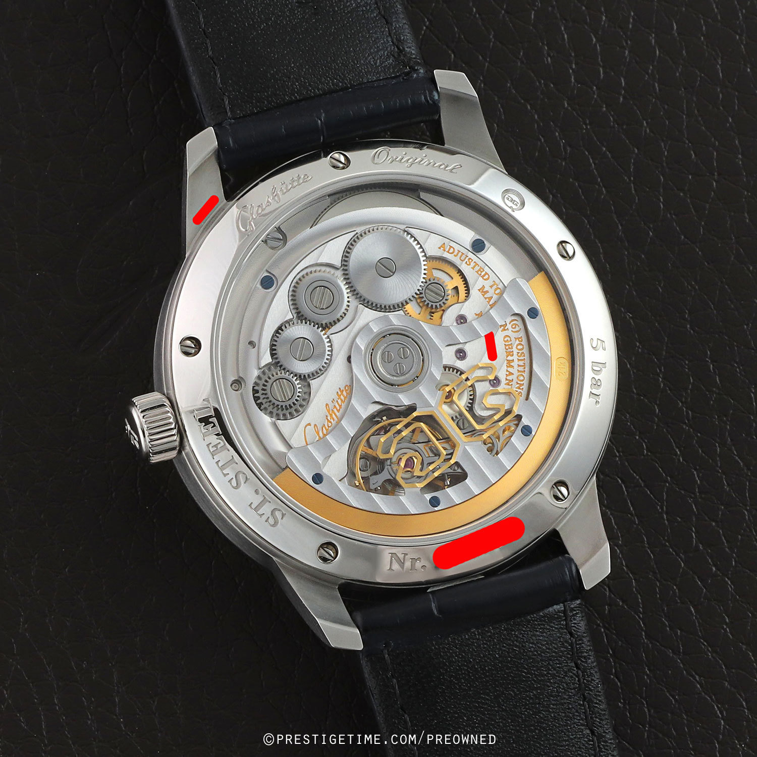 Movement: Powered by an exquisitely finished Glashutte Original in-house calibre 36-24 with a silicon hairspring, beats at 28,800vph (4Hz) contains 43 jewels & an impressive +/-100 hour power reserve. The rotor is skeletonized with the Glashutte double-G logo & features a 21kt gold peripheral oscillation weight.
