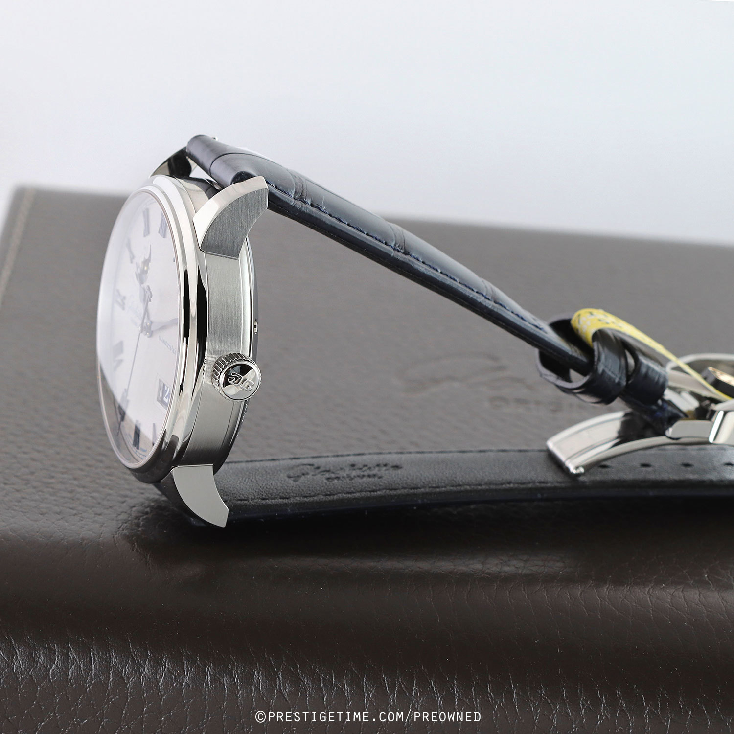 Case: Brushed & polished stainless steel case. Galvanized grey dial with a fine grained pattern finish. Blued steel hands. Applied blue PVD coated white gold Roman numeral hour markers. Fine printed minutes/seconds track.