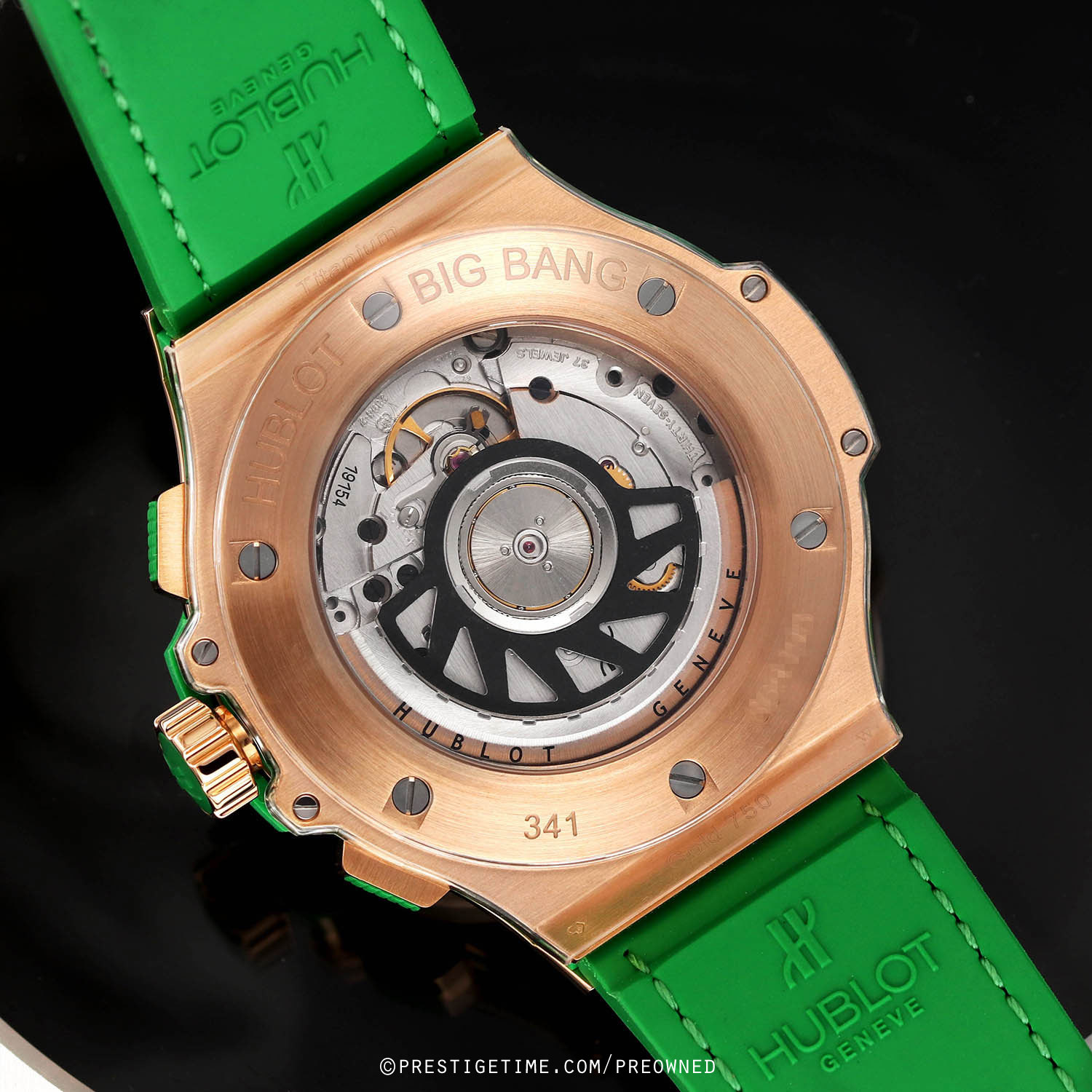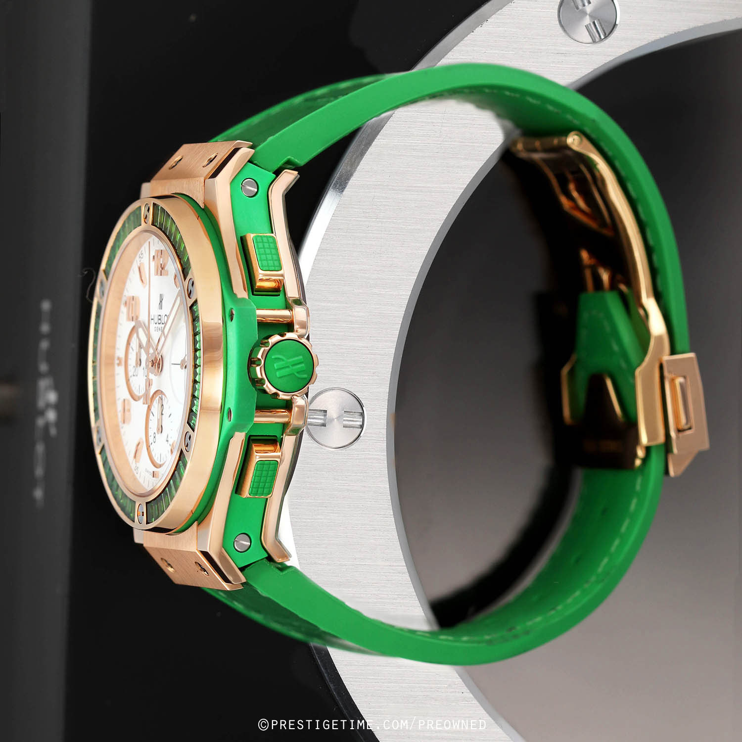 Strap: Fitted on its original Hublot Green gummy-alligator strap (alligator leather top & rubber lining) with a solid 18kt rose gold push-button deployant clasp. The strap is new & unworn with its full wear lifespan remaining.