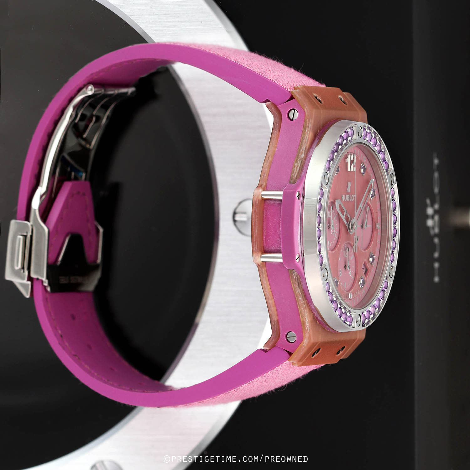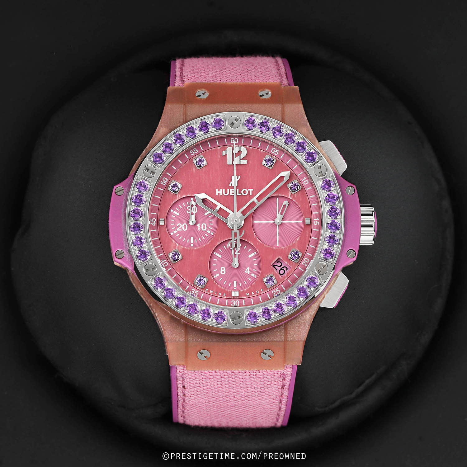 Case: Pink linen composite case. Polished stainless steel crown and pushers with pink rubber inserts. Polished titanium bezel set with 36 round-cut amethysts. Pink composite resin lower bezel ring and lateral inserts. Hot pink linen dial with vertical brushed effect. Polished hands and applied hour markers—eight of which are set with amethysts. Fine printed minute/seconds track. Date window between 4 and 5 o’clock. Small seconds sub-dial at 3 o’clock.