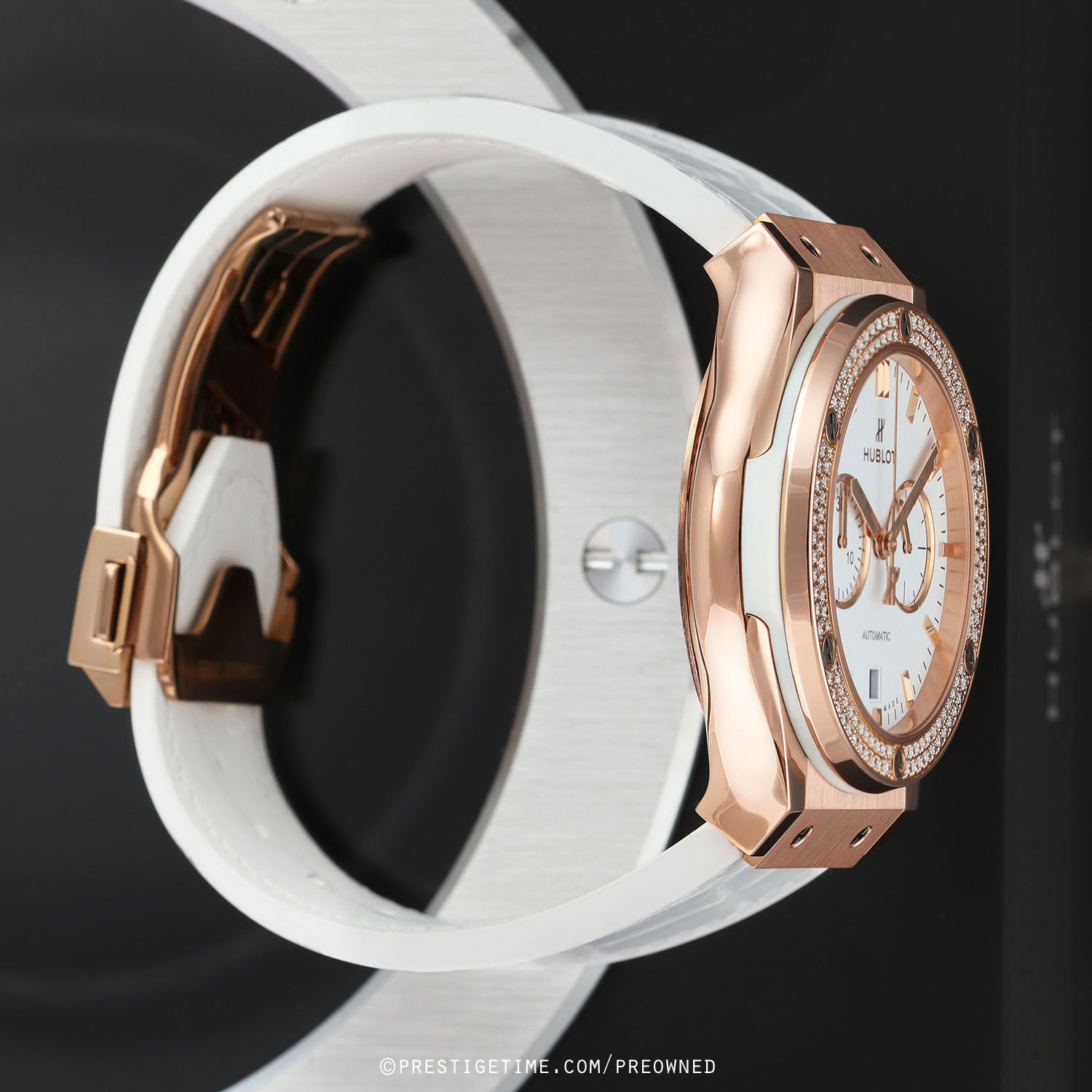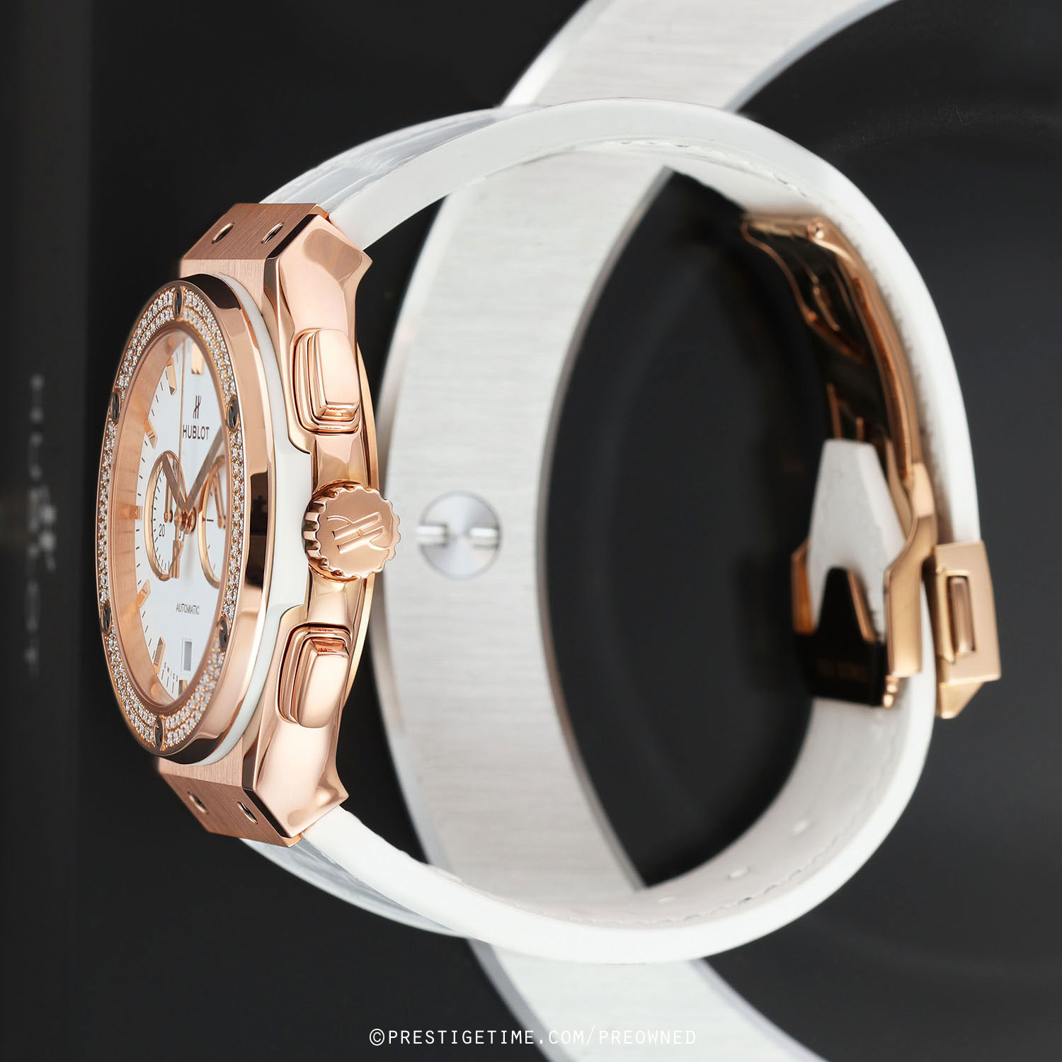 Strap: Fitted on its original Hublot white gummy-alligator strap (alligator leather top & rubber lining) with a push-button 18kt rose gold deployant buckle. The strap is brand new, crisp & unworn with its full wear lifespan remaining.