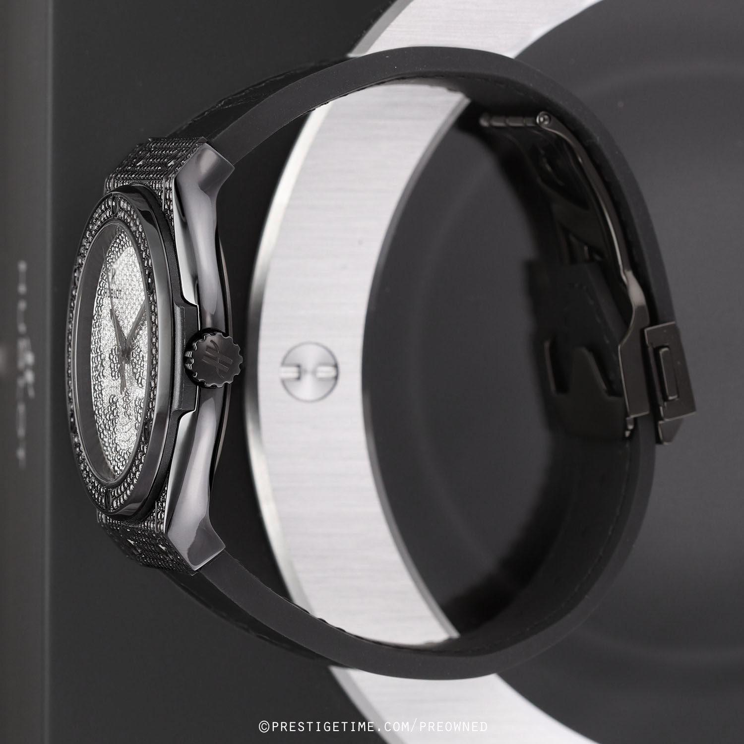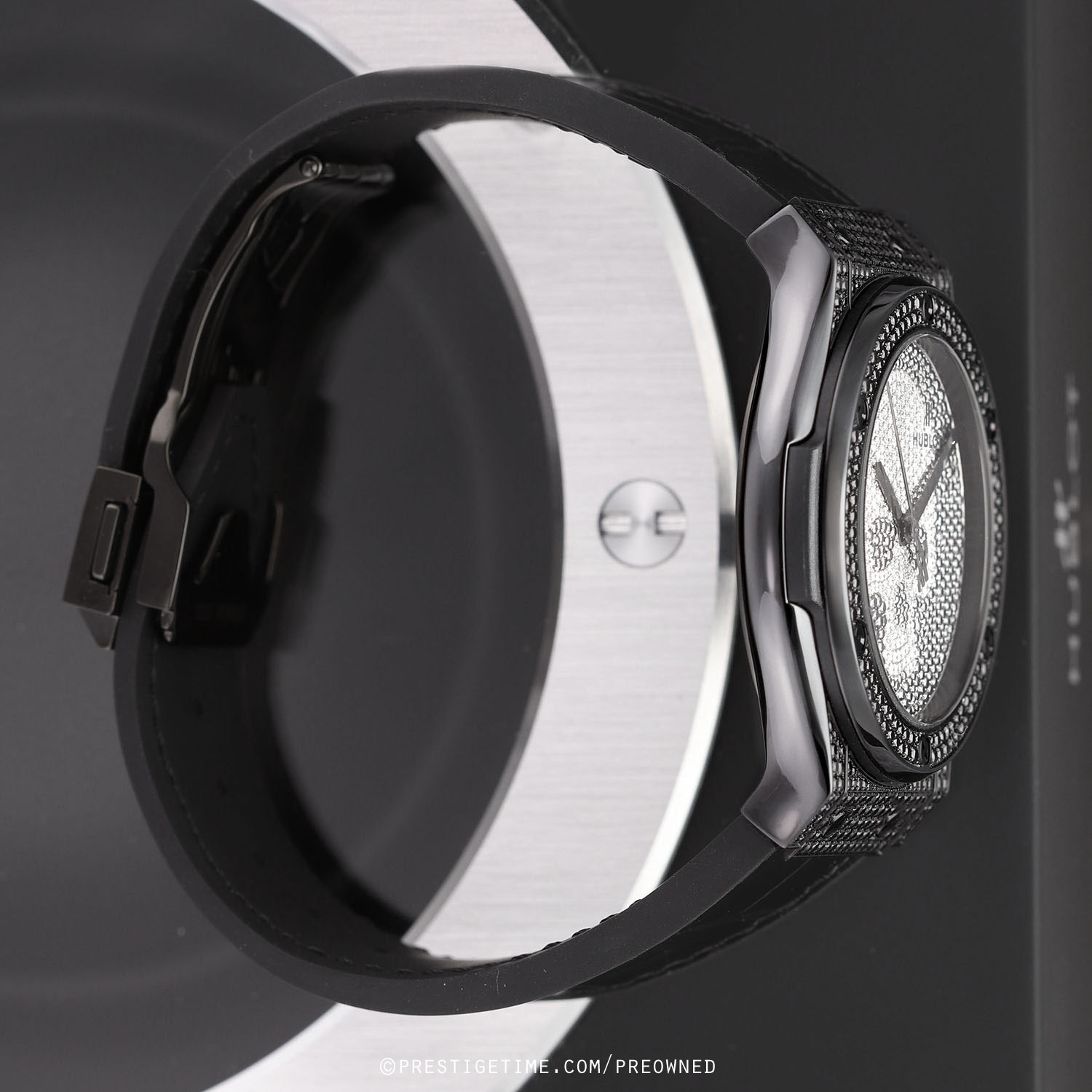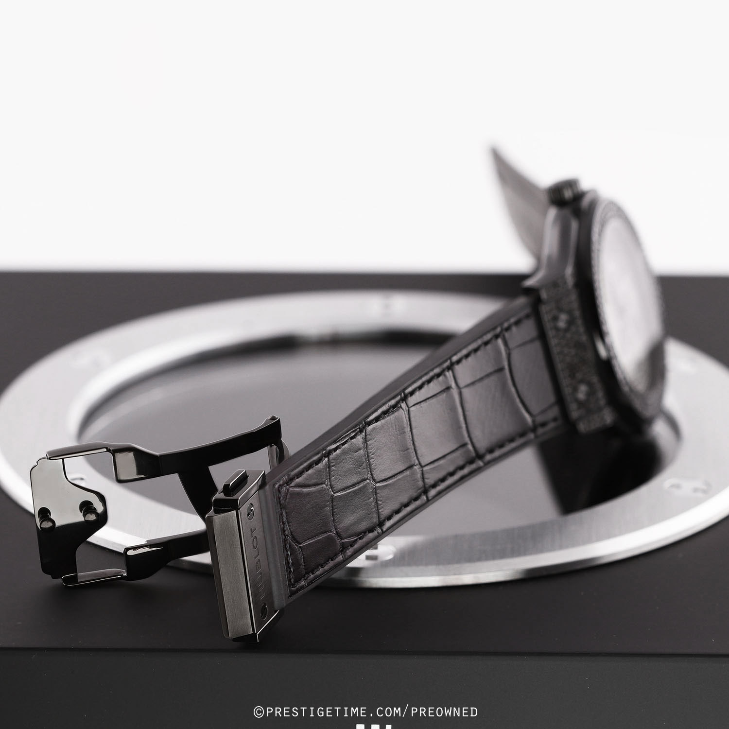 Strap: Fitted on its original Hublot black gummy-alligator strap (alligator leather top & rubber lining) with a push-button black PVD coated stainless steel & titanium deployant buckle. The strap is brand new, crisp & unworn with its full wear lifespan remaining.
