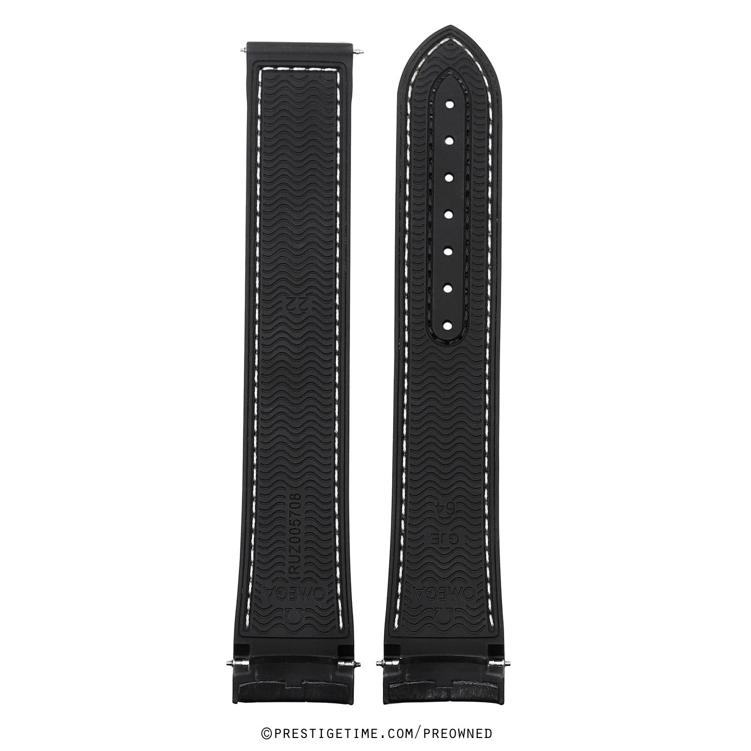 Genuine Extra Long Omega black rubber strap with stitched alligator inlay. Integrated edges for Planet Ocean models with a deployant buckle.