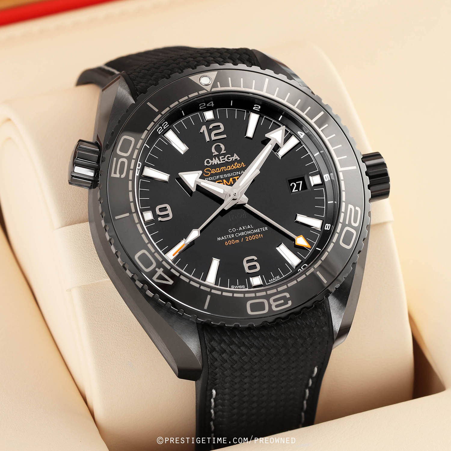 - Indicated by the addition central orange tipped hour hand. This hand makes a single rotation every 24 hours & points to the desired GMT time-zone on the black dial flange.