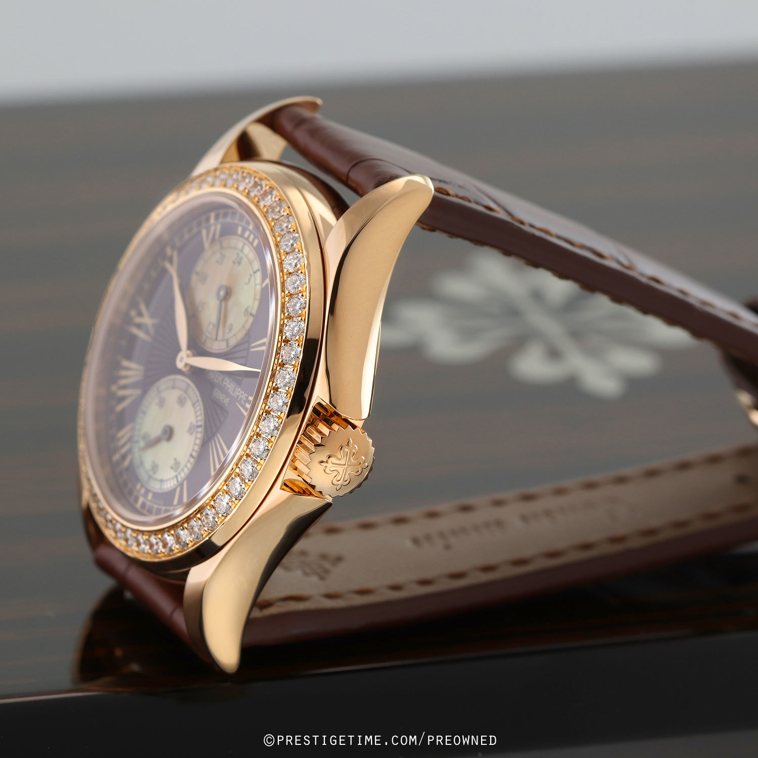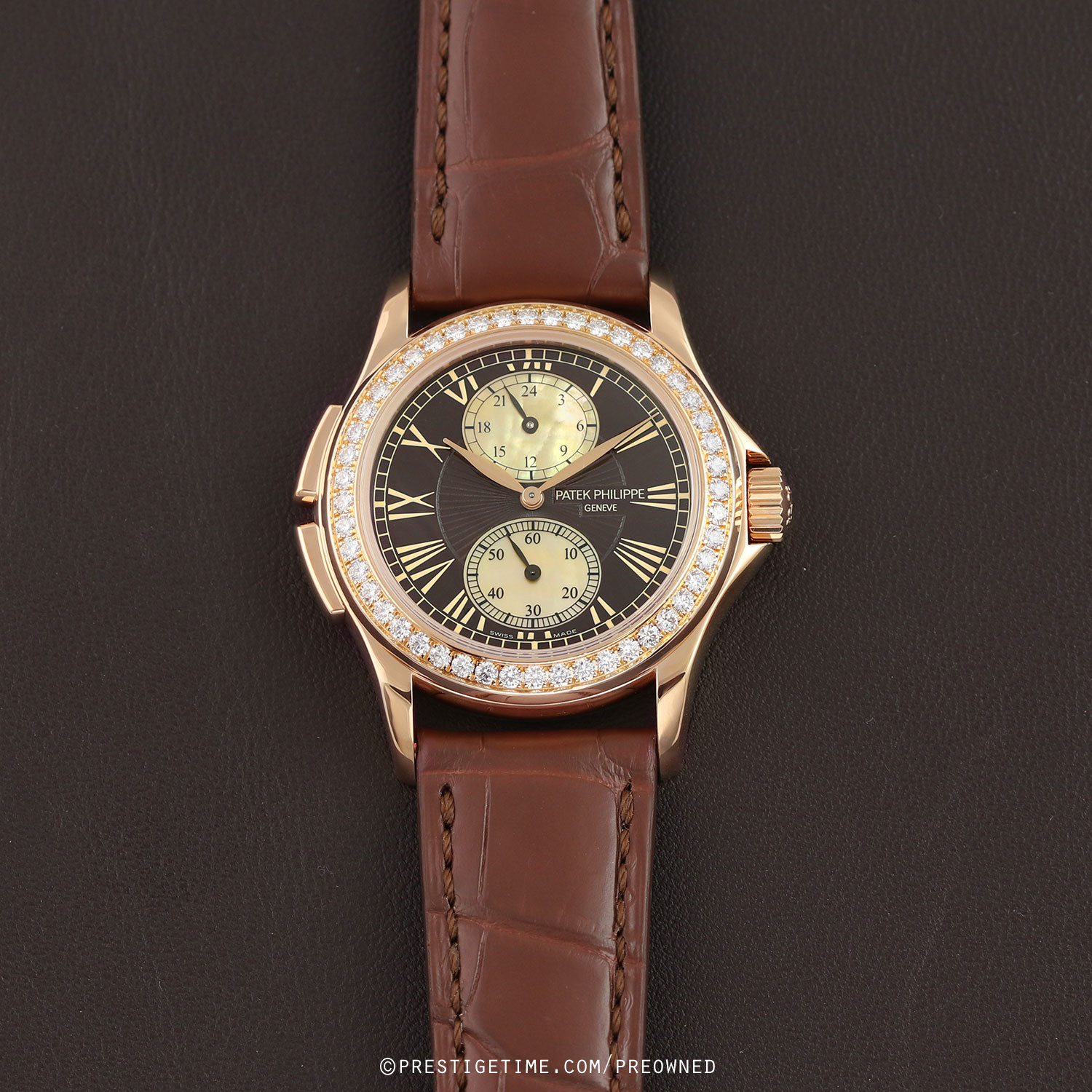 Case: Polished 18kt rose gold case. Bezel factory set with 48 brilliant cut diamonds weighing a total of 1.08 carats. Deep brown main dial with a sun-ray textured center. Off-white mother of pearl sub-dials. Painted gold toned Roman numeral hour markers. Polished rose gold hands center hands, blackened sub-dial hands. Small seconds sub-dial at 6 o'clock.