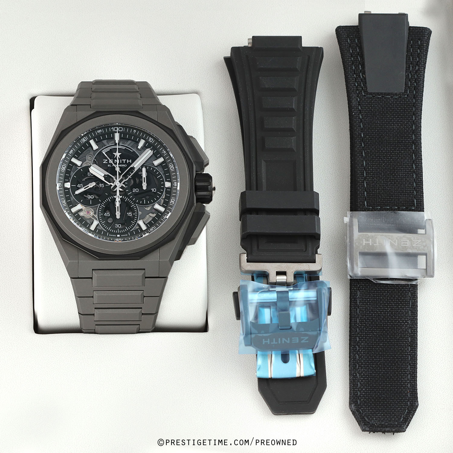 Bracelet & Straps: Interchangeable strap system via buttons on the case back lugs. This watch is delivered with 3 OEM Zenith band options: