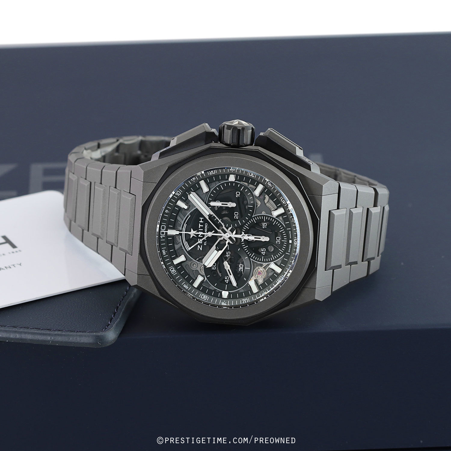 Case: Microblasted titanium case giving the case are darkened grey look. Black titanium lower bezel & chrono button guards. Tinted sapphire crystal dial with black sub-dial rings. Black dial flange with a 1/100th of a second scale. Bold hands, the hour & minute hands with luminous fill. Applied index hour markers with luminous fill. Printed minutes track. Small seconds sub-dial at 9 o'clock.
